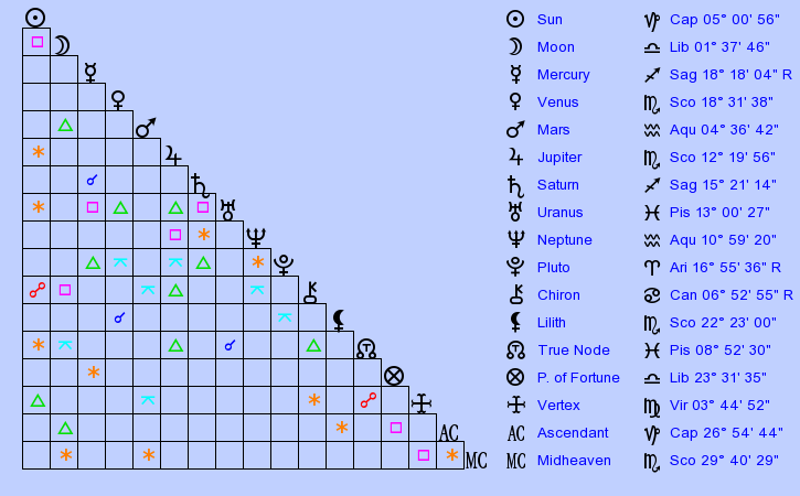 Those with a Capricorn rising are typically reasonable, realistic, dutiful, practical, dedicated, cool and collected, quiet, and sensitive though they are prone to expressing criticism. You are likely to have a good head for business. Communication difficulties may have been present in your early development. Deep down you may feel as though you are not good enough and these insecurities spur you forward to work harder, pushing you to dedicate yourself even more fiercely to your ambitions. Perseverance comes naturally to you and you will not step down until you have accomplished your goals. Status and wealth are valuable to you. Often others will see you as cold when it is more that you are reserved. In your mind, you believe that you are merely being responsible. This placement implies susceptibility towards physical ailments regarding the knee joints and surrounding areas; when trouble occurs, it may be a sign of being inflexible in your person. A life lesson that may need to be learned is to curb a tendency of behaving in a sombre, serious manner and foster a more social, cheerful demeanour and outlook. Capricorn in ruled by the planet Saturn and therefore its placement in your chart will be significant in your life.