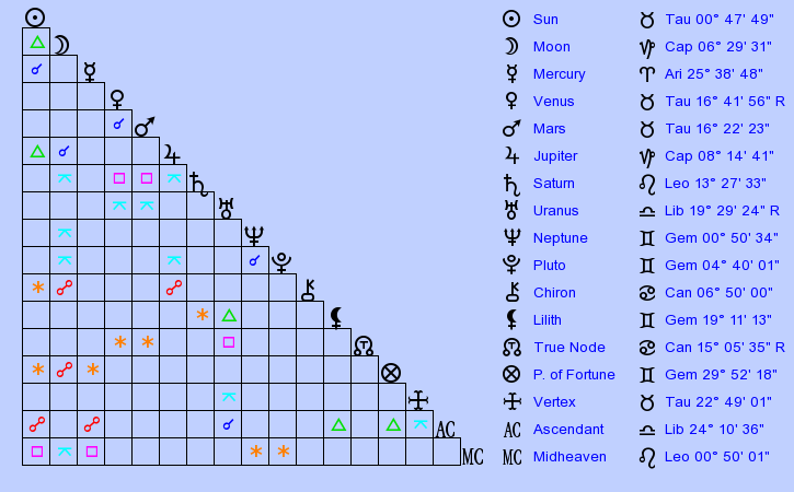 Creativity comes easily to you and you are most successful at reaching your aims when those you care for are there to encourage you. You are able to find a perfect balance between independence and connecting with others. You are self-sufficient, doing just fine alone whenever needed. Previous lives were used to master your emotional reactions and they are now harmonious. Good karma draws good fortune to you in all aspects: status, home-life, friendship, respect, healthiness, and monetary assets. Naturally capable and talented, you soar to the top either by gaining the respect and admiration of those in high places who will aid you on your journey, or you yourself find an area of expertise where you create your own success. Both the external and internal forces at work for you are blended harmoniously, making your life a bit easier than it could otherwise be. All of your challenges are aided by this aspect and despite the obstacles, you will find tranquillity.