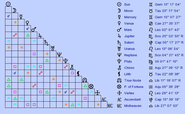 This aspect presents you with a chance to attain a higher reasoning in spirituality by self-sacrifice and working diligently to aid others. You will be able to put your necessities on the back burner to do what needs to be done for those loyal to you and this kind of service is happily done by you. You can easily combine your idealistic views with realism in a fantastic way. You will often remove your emotions from a situation so that you may finish what youve started. Any dream you aspire to, you will put forth a great deal of effort to accomplish. You are able to get by on mere scraps when you feel it is needed to achieve your aim. Imaginative applied artistry is your specialty. This aspect implies that the native is protected spiritually by karma from a previous life where they had aided others.