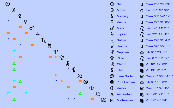 When choosing a romantic partner, you are more moved by intelligence than mere looks. You prefer someone who is an intellectual, inquisitive, clever, witty, and communicates well. Because you can lose interest quickly, you require a partner that will stimulate your mind and possibly even provide some sort of obstacle for you to untangle. You enjoy always having something exciting going on in your relationships; the more you can learn and experience, the better. Communicating, exchanging ideas, going on random adventures, and socialising with your companion are essential to your happiness in a partnership. However, you have a charming personality and are naturally flirtatious with others which can create problems if you are with a partner that tends to be more possessive and envious; these sorts of behaviours usually do not bode well with you. It is best if you are allowed freedom to interact with new people in your naturally out-going, charismatic, lively fashion. Be mindful not to break too many hearts on your way to finding the right partner, as you can tend to easily change your mind about a person quite suddenly or date multiple people at once. Commitment is difficult for you to invest in and you often enjoy the thrilling excitement of the early stages of romance more than the later stages. You are gifted in articulating yourself in all forms; writing, speaking, singing, and the like. You tend to remove yourself from your emotions and objectively analyse your feelings. If Venus is negatively aspected, you may have trouble with your lungs or the oxygen in your system.