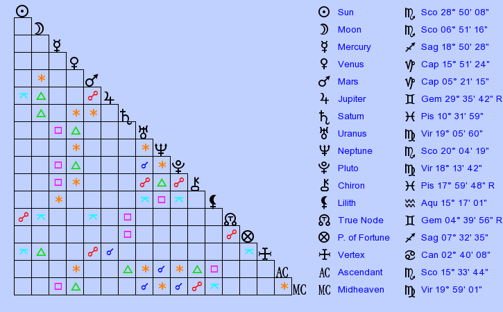 You are cunning, quick-witted, and jovial. Experiencing other cultures and new places appeals to you as you are able to learn much from these endeavours. You may have a gift for learning to communicate in a different language. However, internally you possess an anxious tension that you try to counter by nervous banter, communicating excessively, or making commitments that you are unable to follow through on. Working in literature may appeal to you. You are innovative and able to comprehend abstract concepts, as well as enjoy applying your mind to mathematical subjects. You seek out situations that will challenge you and alter your perception or help you grow in knowledge or wisdom. Justice or religious practices may also draw your attention.