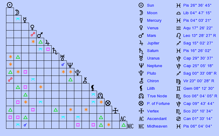 Highly interested in foreign cultures, you are likely to move away from where you were raised. Travelling in all forms is very appealing to you and you are likely to experience a gain from these situations. You are able to be a diplomatic presence between different cultures. There is a strong interest and enjoyment in religious ceremonies, philosophical studies, education, or law and you enjoy creative material brought to you from other cultures such as music, art, or items that are aesthetically pleasing. You are just and reasonable in legal transactions.