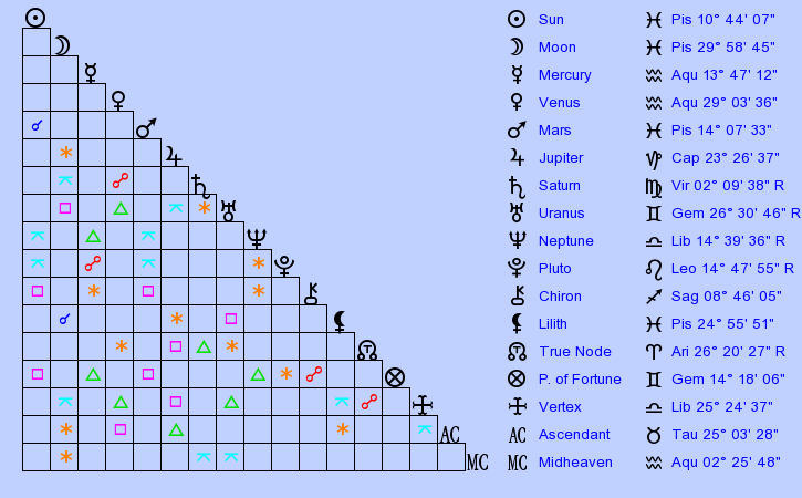 Pisceans are sensitive, kind, caring, unobtrusive, amiable, flexible, prophetic, private, mysterious, and altruistic with excellent intuition and a bend towards idealism (learn about compatibility with Pisces here). However, when afflicted they are capable of being overly-emotional, fickle, gullible weaklings who wallow in their own despair and cannot make a decision. Aiding others helps them achieve balance within.