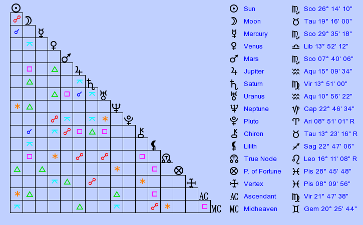 You possess an extraordinary ability to focus and may find yourself completely engrossed in your projects. With natural investigative skills, you enjoy having to decipher complex problems. The topic of sex or death may be a mental theme for you, as you are often preoccupied with carnal desires or physical fascinations of any sort. You are strongly intuitive and observant, and may need to acquire knowledge through your own practice rather than relying on traditional educational methods. You may thrive working in the field of manual labour as you can do well with mechanics. Healing others is another avenue in which you may find success, especially with something involving your hands. You are capable, witty, insightful, clever, astute, and will often speak your mind bluntly and forcefully. Sarcasm and dark humour are right up your alley. You employ a double standard with others where you will keep your own thoughts reserved while leaving no stone unturned on your quest to discover other peoples secrets. You are exceptionally perceptive in comprehending the complexities of human nature and of any challenge presented to you, especially when you must plunge into hidden depths. However, you are not without your faults and can be argumentative, contrary, inflexible, doubtful, sarcastic, suspicious, and wilful. Mystical subjects may appeal to you.
