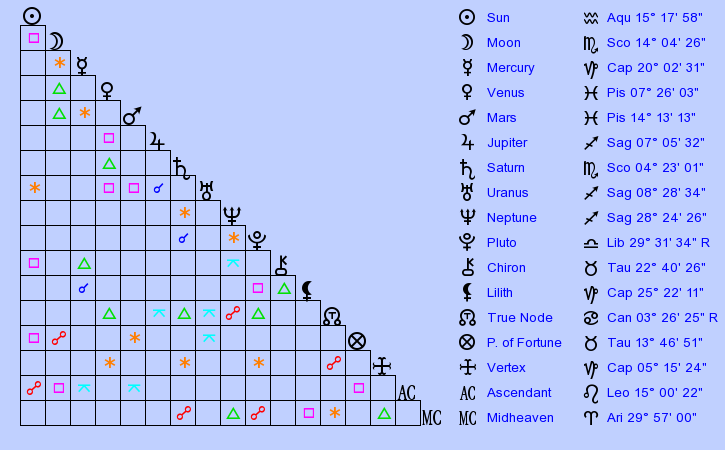 This aspect presents you with a chance to attain a higher reasoning in spirituality by self-sacrifice and working diligently to aid others. You will be able to put your necessities on the back burner to do what needs to be done for those loyal to you and this kind of service is happily done by you. You can easily combine your idealistic views with realism in a fantastic way. You will often remove your emotions from a situation so that you may finish what youve started. Any dream you aspire to, you will put forth a great deal of effort to accomplish. You are able to get by on mere scraps when you feel it is needed to achieve your aim. Imaginative applied artistry is your specialty. This aspect implies that the native is protected spiritually by karma from a previous life where they had aided others.