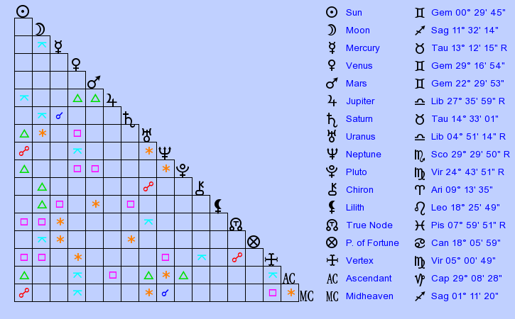 When choosing a romantic partner, you are more moved by intelligence than mere looks. You prefer someone who is an intellectual, inquisitive, clever, witty, and communicates well. Because you can lose interest quickly, you require a partner that will stimulate your mind and possibly even provide some sort of obstacle for you to untangle. You enjoy always having something exciting going on in your relationships; the more you can learn and experience, the better. Communicating, exchanging ideas, going on random adventures, and socialising with your companion are essential to your happiness in a partnership. However, you have a charming personality and are naturally flirtatious with others which can create problems if you are with a partner that tends to be more possessive and envious; these sorts of behaviours usually do not bode well with you. It is best if you are allowed freedom to interact with new people in your naturally out-going, charismatic, lively fashion. Be mindful not to break too many hearts on your way to finding the right partner, as you can tend to easily change your mind about a person quite suddenly or date multiple people at once. Commitment is difficult for you to invest in and you often enjoy the thrilling excitement of the early stages of romance more than the later stages. You are gifted in articulating yourself in all forms; writing, speaking, singing, and the like. You tend to remove yourself from your emotions and objectively analyse your feelings. If Venus is negatively aspected, you may have trouble with your lungs or the oxygen in your system.