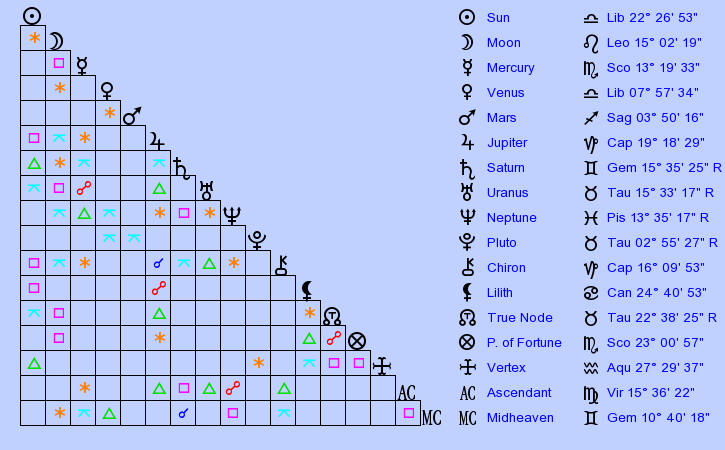 Mentally you are rather serious and intentional, with great ability to focus. You are an excellent coordinator and easily decipher complex situations while finding realistic resolutions to whatever difficultly is presented to you. Acquiring knowledge is something you thoroughly enjoy spending your time on. However, you must be mindful of a tendency towards pessimistic, overly sceptical, and gloomy thinking. Anxiety may become an issue for you and there seems to always be sensitivity with your lungs or trouble with oxygen in the system. Take care to keep the air circulating in your bedchamber. The influences of Saturn in this placement will stabilise the typical fickle behaviours of Gemini and allow you to be more mentally balanced. Saturn in Gemini can be very beneficial though you must try to stay positive about what may come to pass. To achieve success, it is necessary for you to cultivate a more systematic way of thinking and behaving.