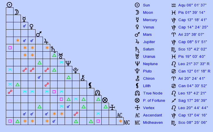 Those with a Capricorn rising are typically reasonable, realistic, dutiful, practical, dedicated, cool and collected, quiet, and sensitive though they are prone to expressing criticism. You are likely to have a good head for business. Communication difficulties may have been present in your early development. Deep down you may feel as though you are not good enough and these insecurities spur you forward to work harder, pushing you to dedicate yourself even more fiercely to your ambitions. Perseverance comes naturally to you and you will not step down until you have accomplished your goals. Status and wealth are valuable to you. Often others will see you as cold when it is more that you are reserved. In your mind, you believe that you are merely being responsible. This placement implies susceptibility towards physical ailments regarding the knee joints and surrounding areas; when trouble occurs, it may be a sign of being inflexible in your person. A life lesson that may need to be learned is to curb a tendency of behaving in a sombre, serious manner and foster a more social, cheerful demeanour and outlook. Capricorn in ruled by the planet Saturn and therefore it’s placement in your chart will be significant in your life.