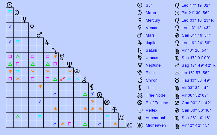 You radiate positive energy and have a confident, joyous demeanour. Your warmth and kindness is enjoyed by all around you. You are an innovative leader, devising magnificent ideas and coordinating them. You strive to achieve great heights in your life. You have high standards and assume that they will be met, and they usually are due to the considerate aid of others or through your own dedication. This placement bestows the recipient with luck, monetary prizes, eagerness, and self-assurance. The one thing you must be mindful of with this aspect is a tendency towards indulging yourself too much or engaging in wasteful behaviour. You may also need to curb your pride as you can get carried away with your own good qualities. Saving money may be difficult for as you are carefree in this regard, spending abundantly whenever the mood strikes. Deep down you crave to better understand yourself and to find your lifes purpose. Traveling is particularly enjoyable to you and your work may involve travel of some form. At times it may feel as though you are being watched over by a supernatural force as you seem to barely escape without injury at times, but always somehow do; you are protected. Good karma from a previous life, due to your kind heart and giving nature, has earned you these blessings and many would agree that you are indeed blessed. Utilise these gifts carefully and in a positive way.