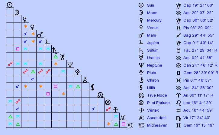 This aspect presents you with a chance to attain a higher reasoning in spirituality by self-sacrifice and working diligently to aid others. You will be able to put your necessities on the back burner to do what needs to be done for those loyal to you and this kind of service is happily done by you. You can easily combine your idealistic views with realism in a fantastic way. You will often remove your emotions from a situation so that you may finish what youve started. Any dream you aspire to, you will put forth a great deal of effort to accomplish. You are able to get by on mere scraps when you feel it is needed to achieve your aim. Imaginative applied artistry is your specialty. This aspect implies that the native is protected spiritually by karma from a previous life where they had aided others.