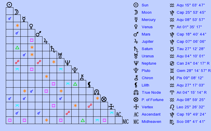 This aspect presents you with a chance to attain a higher reasoning in spirituality by self-sacrifice and working diligently to aid others. You will be able to put your necessities on the back burner to do what needs to be done for those loyal to you and this kind of service is happily done by you. You can easily combine your idealistic views with realism in a fantastic way. You will often remove your emotions from a situation so that you may finish what youve started. Any dream you aspire to, you will put forth a great deal of effort to accomplish. You are able to get by on mere scraps when you feel it is needed to achieve your aim. Imaginative applied artistry is your specialty. This aspect implies that the native is protected spiritually by karma from a previous life where they had aided others.