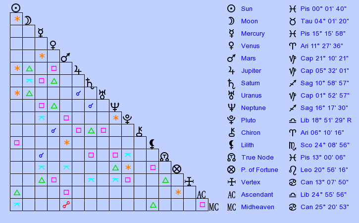 Pisceans are sensitive, kind, caring, unobtrusive, amiable, flexible, prophetic, private, mysterious, and altruistic with excellent intuition and a bend towards idealism (learn about compatibility with Pisces here). However, when afflicted they are capable of being overly-emotional, fickle, gullible weaklings who wallow in their own despair and cannot make a decision. Aiding others helps them achieve balance within.