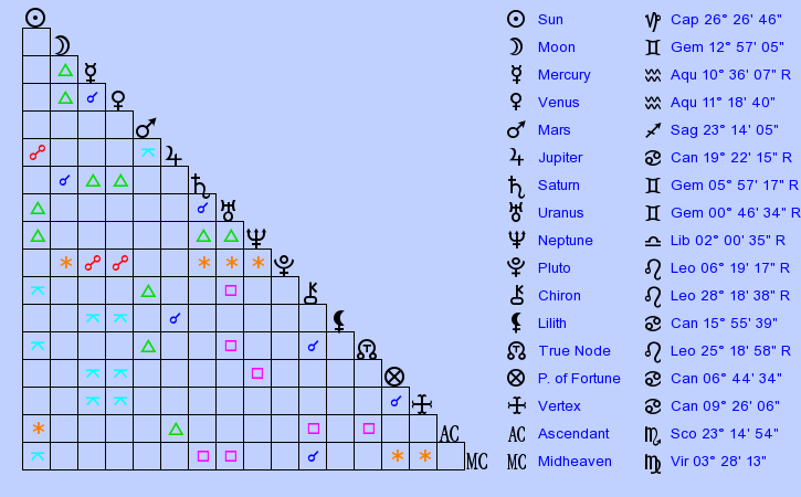 This aspect presents you with a chance to attain a higher reasoning in spirituality by self-sacrifice and working diligently to aid others. You will be able to put your necessities on the back burner to do what needs to be done for those loyal to you and this kind of service is happily done by you. You can easily combine your idealistic views with realism in a fantastic way. You will often remove your emotions from a situation so that you may finish what youve started. Any dream you aspire to, you will put forth a great deal of effort to accomplish. You are able to get by on mere scraps when you feel it is needed to achieve your aim. Imaginative applied artistry is your specialty. This aspect implies that the native is protected spiritually by karma from a previous life where they had aided others.